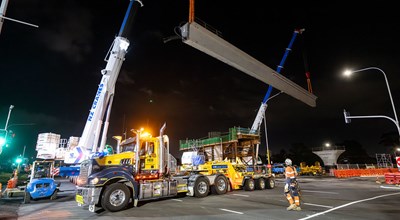 NZ Cranes has been contracted to lift and install all 136 Super T Bridge Beams, weighing up to 82 tonnes each to construct the Rā Hihi flyover on the Eastern Busway project in Auckland.