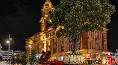 NZ Crane Hire took part in a nine-hour crane operation during the night to move the first two of seven mature Pohutukawa trees back to Quay Street.